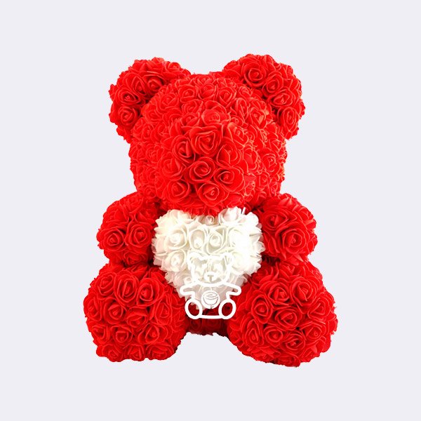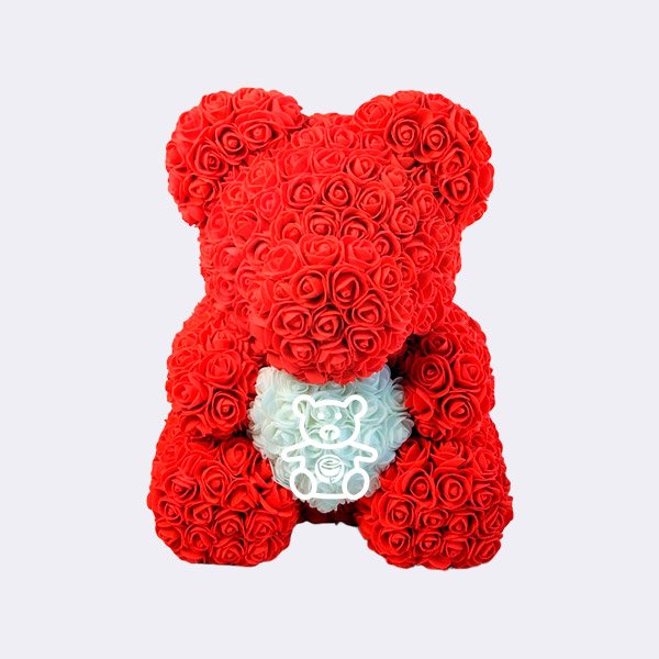 Este oso de rosas artificiales de foam rojas está compuesto de 450 rosas con una altura de 40cm, quedando como resultado final un fantástico osito con el que quedarás encantado. Además, en el centro tiene un corazón de rosas blancas que lo hace aún más mágico. Este osito rojo va montado en su caja de PVC (estuche) listo para regalar.